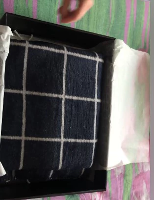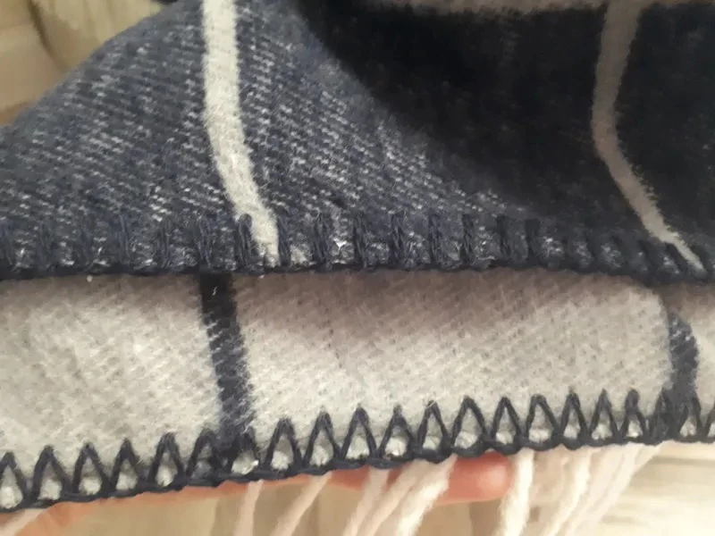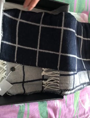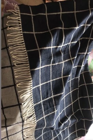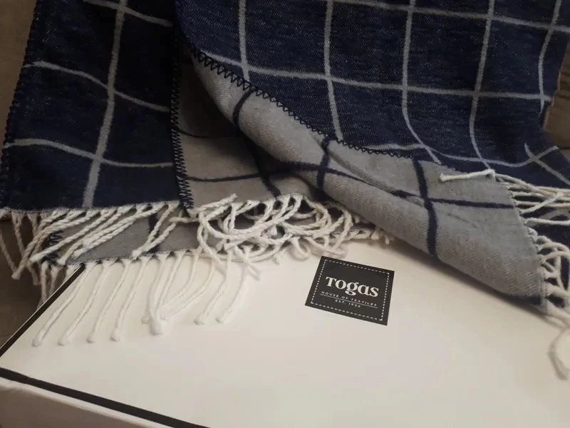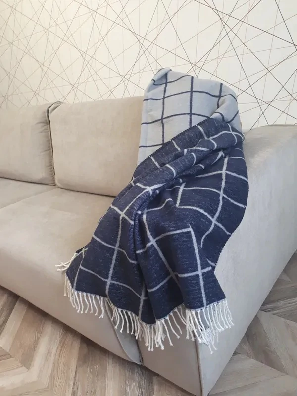 Это классический плед, декорированный бахромой и оформленный традиционным орнаментом – крупной клеткой. Двусторонняя модель выполнена в сине–белой гамме. Синий цвет и строгий дизайн превращают такой плед в прекрасный подарок для мужчины.
