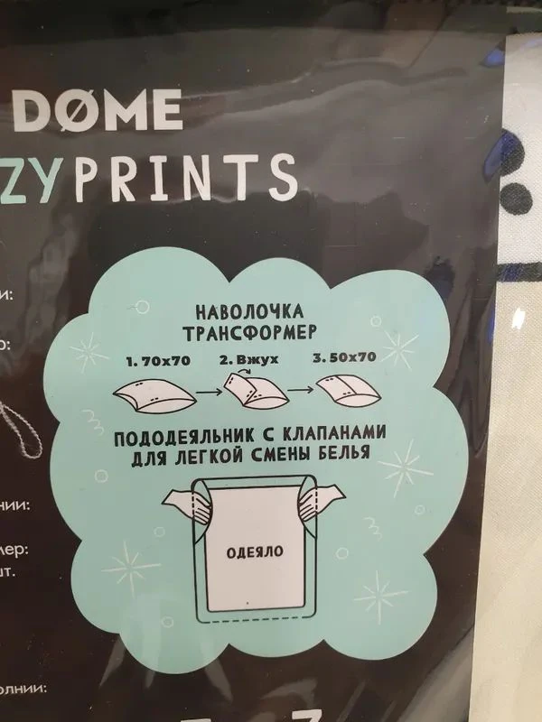 | Особые детали | Двустороннее, Декоративный кант, Наволочки с застёжкой на кнопках, Пододеяльник с клапанами для рук, Наволочки-трансформеры |