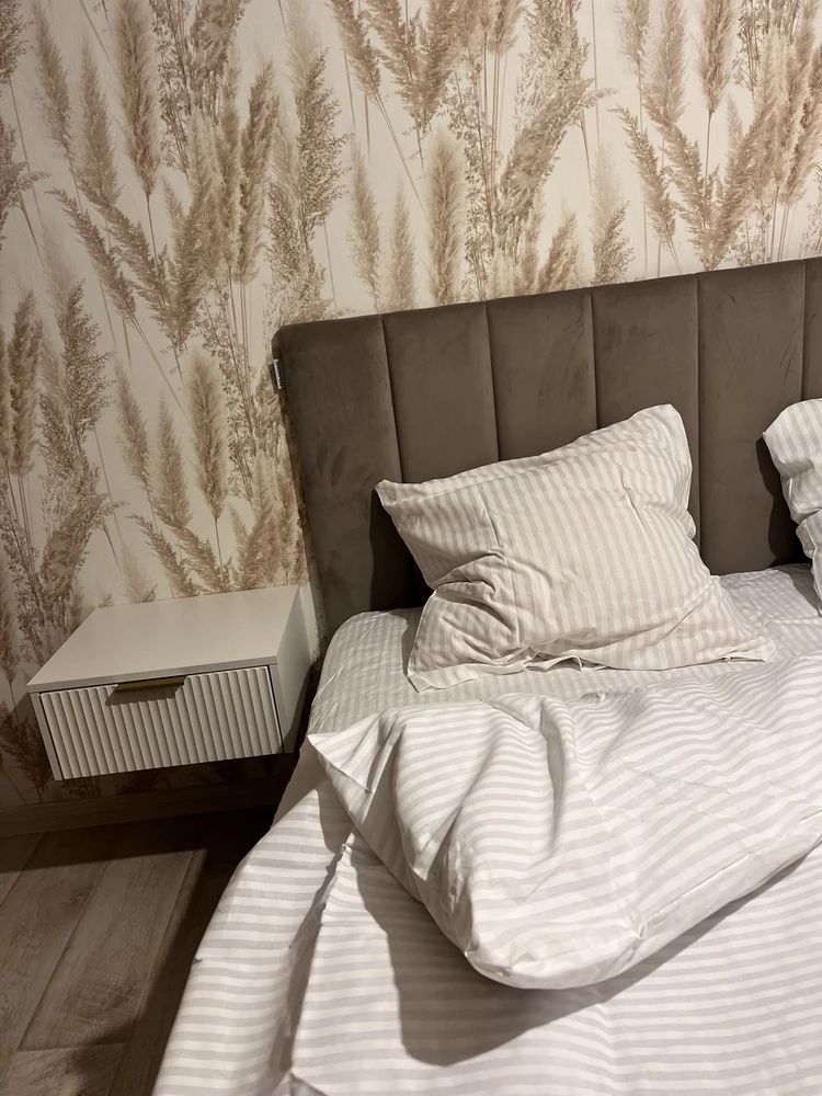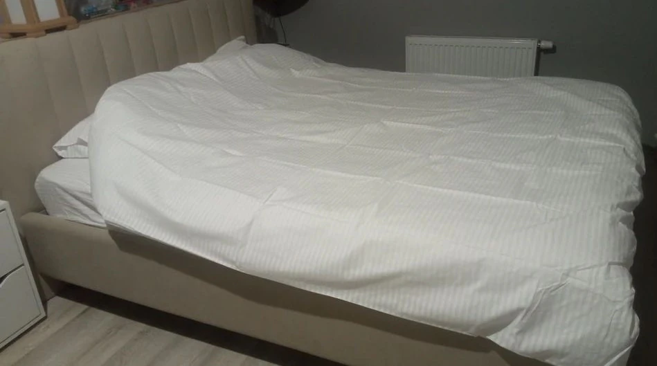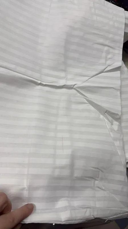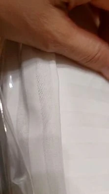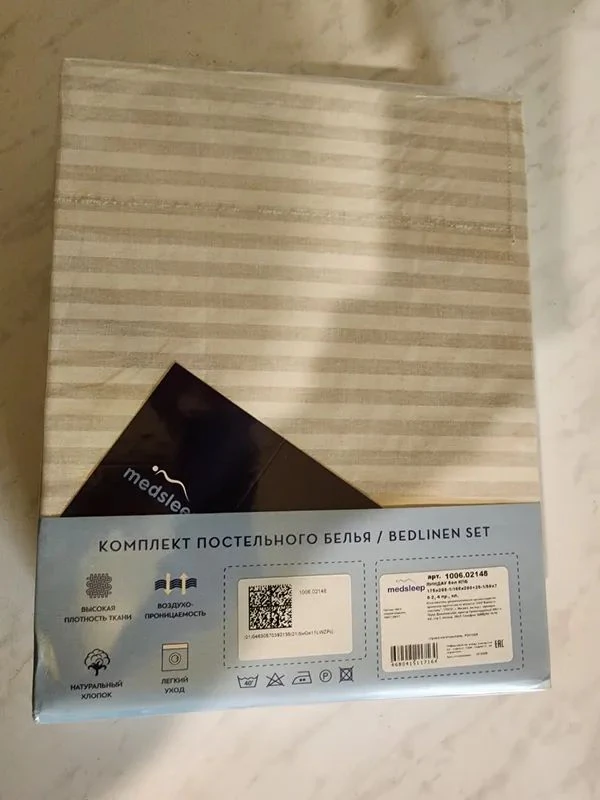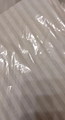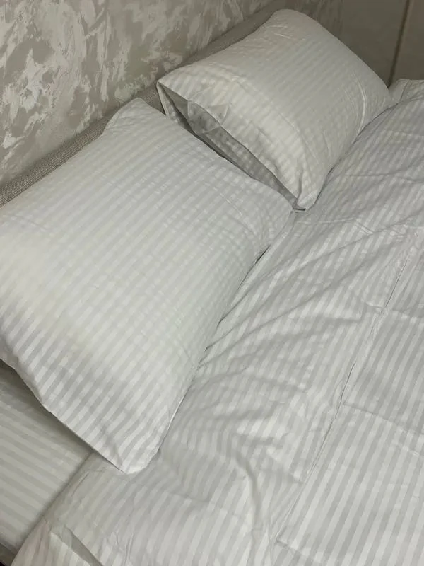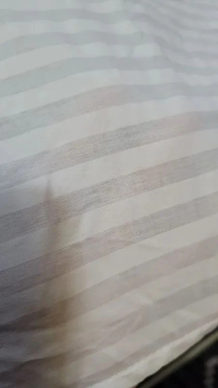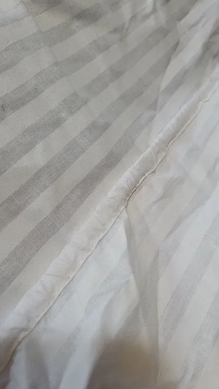 Ткань, полосочки немножко просвечивают, по этому если хочется белоснежное полотно, лучше на белую подушку и одеяло использовать. У меня они коричневые и поэтому выглядит на кровати будто полоски светлосеренькие. Но мне наоборот нравится!