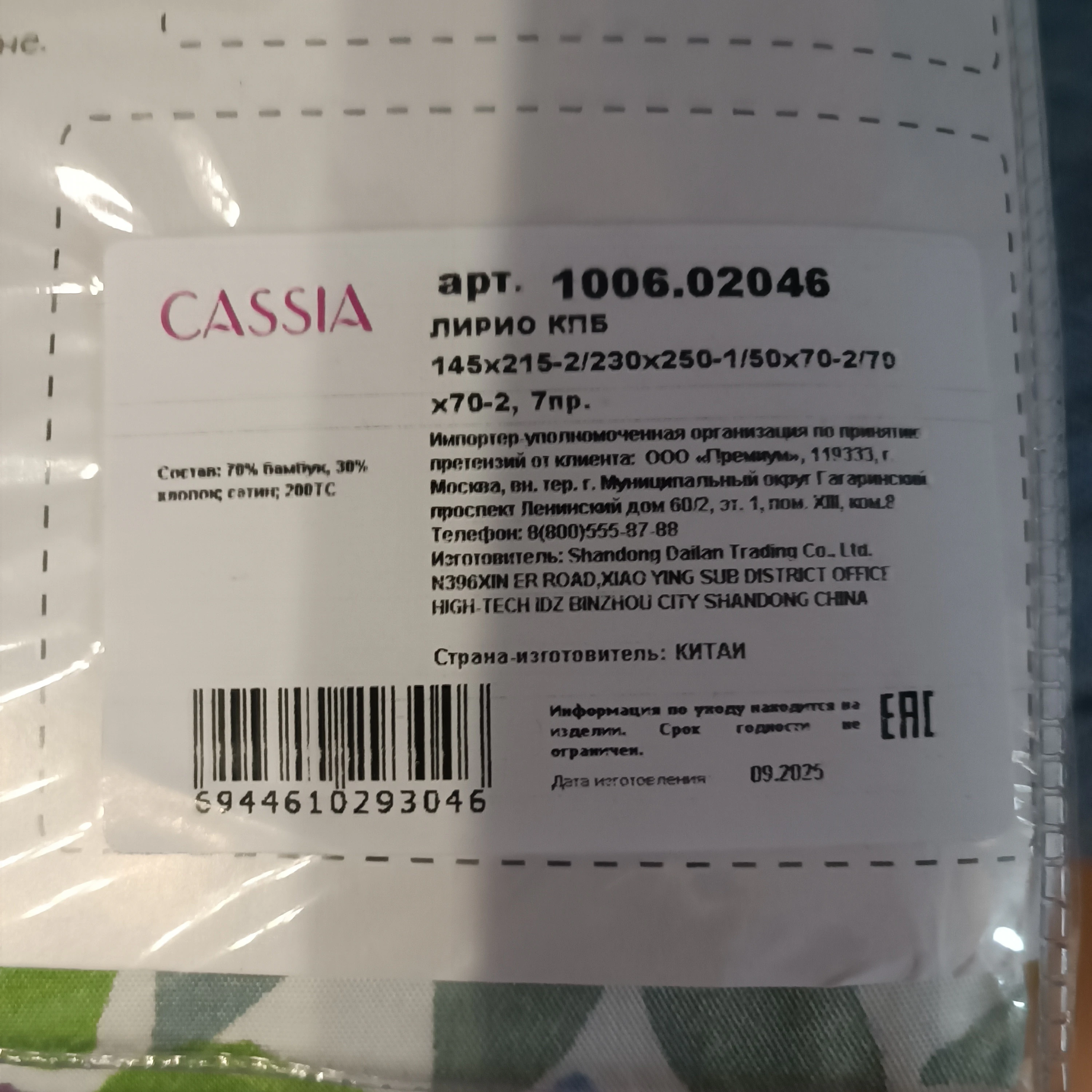 Комплектация | Пододеяльник на молнии 145х215 - 2 шт, простыня обычная 230х250 - 1 шт, наволочки на запах 50х70 - 2 шт и 70х70 - 2 шт |