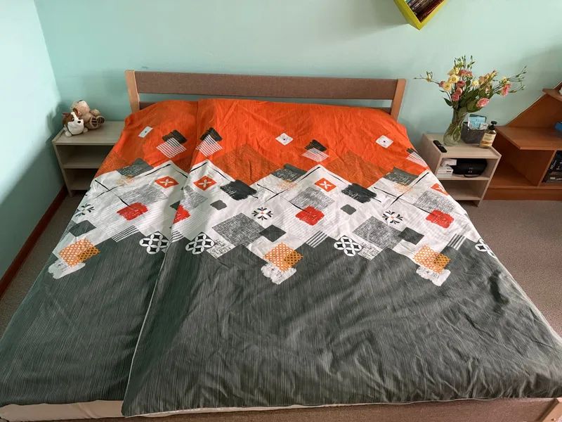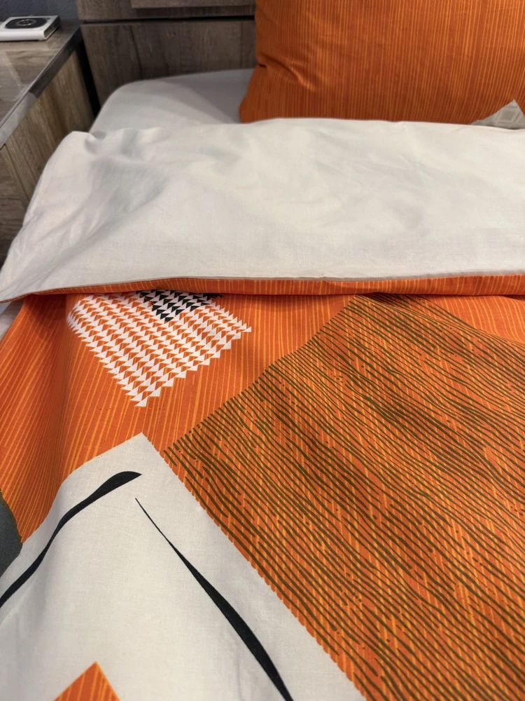 Двусторонний дизайн постельного белья позволяет легко менять облик спальни по вашему желанию. Комплект выделяется своим ярким и современным дизайном, основные цвета создают контраст, наполняя пространство энергией и теплом. Узор состоит из абстрактных геометрических форм и текстур, включая квадратные и прямоугольные элементы, что придаёт комплекту динамичность и оригинальность. Эта игра форм и цветов создает атмосферу креативности и современности. Такой комплект идеально подойдет для интерьеров в стиле модерн или эклектика, добавляя яркие акценты и подчеркивая индивидуальность. Он станет замечательным акцентом, создающим уют и стиль в вашей спальне.
